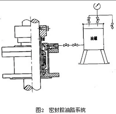 雙端面密封阻封液的注入方法,也經過詳細的考慮和計算。密封腔裝在塔高27m的塔頂處,安裝1條阻封液管線,不僅工作量大,而且不經濟。考慮到轉盤塔的轉速為0.5r/s,摩擦熱量和攪拌熱量均比較小,所以改用固定式氣壓注油法代替阻封液管線,見圖2。