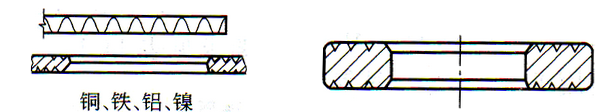 常用的為紫銅(退火后使用)、鋁制作,適用于高溫高壓的場合下。成形的還有波形墊片,用于壓力不大于3MPa的場合下,如圖1一l所示;圖1—2為鋸齒形墊片,主要用于高壓密封處。常使用在化工設備的人孔或視孔等處,使用時兩面配用藍石棉板制成墊片。