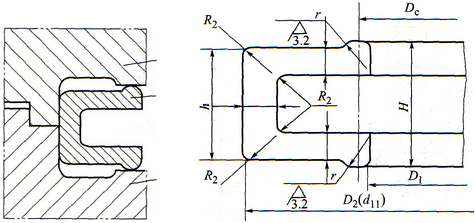 C形環密封結構如圖1—5所示,在C形環密封件上下方有兩個凸出的圓弧面為密封面,加適當的預緊力后,達到一定的密封作用。在C形環受到壓力的作用下,迫使環口上下張開,壓力越大,張開力越大,從而達到密封的目的。
