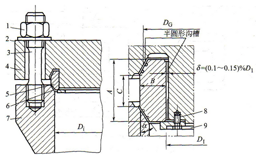 (1一主螺母;2-墊圈;3--主螺栓;4-平蓋;5--雙錐環;6-軟金屬墊片;-筒體端部;8-螺栓;9-托環)