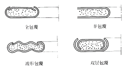該密封墊片以非金屬材料為芯材,外層包覆著厚度為0.25~0.5mm的金屬薄板。按包覆狀態,可分為全包覆型密封墊片、半包覆型密封墊片、波形包型覆密封墊片、雙層包覆型密封墊片等。見圖2。