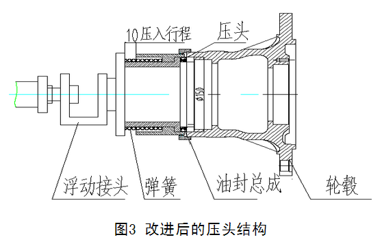 c)本工藝的特點在于:此壓頭與汽缸活塞桿的連接采用浮動接頭,使壓頭相對活塞桿具有柔性,當壓頭卡住油封外圓時,油封進入輪轂的型腔不發生卡滯、扭轉;它的優點是即使壓頭中心與油封中心有一定偏差時,壓頭能自動找正,因此大大降低油封進入輪轂的型腔對安裝工藝定位的要求。
