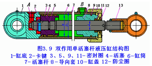 上圖給出了雙作用單活塞桿液壓缸的結構圖,該液壓缸主要由1缸底、6缸筒、10缸蓋、4活塞、7活塞桿和8導向套等組成;缸筒一端與液壓缸底焊接,另一端與液壓缸蓋采用螺紋連接。活塞與活塞桿采用卡鍵連接,為了確保液壓缸的可靠密封,在相應位置設置了密封圈3、5、9、11和12防塵圈密封件。