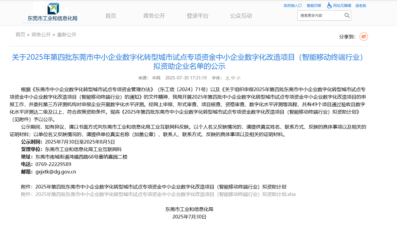 近日,東莞市工業和信息化局發布《關于2025年第四批東莞市中小企業數字化轉型城市試點專項資金中小企業數字化改造項目(智能移動終端行業)擬資助企業名單的公示》,廣東東晟密封件科技有限公司下稱東晟密封件”“DSHmf.com”)憑借在密封件領域數字化改造的深厚積累與亮眼創新成果,成功通過驗收且數字化水平評測達二級以上,成為本次49個通過項目之一。這一榮譽標志著東晟密封件在密封件行業的數字智造)水平已處于領先地位。